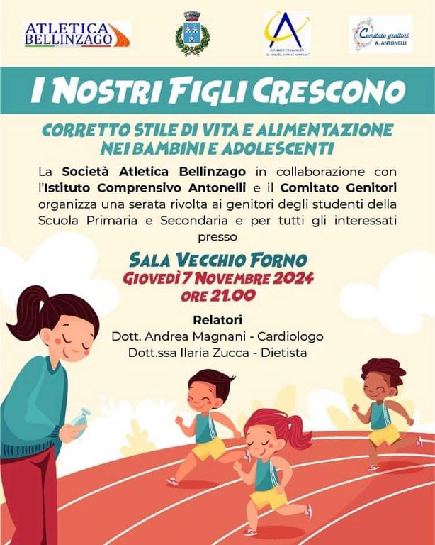 L'Associazione Sportiva Dilettantistica Atletica Bellinzago organizza per giovedì 7 novembre 2024, alle ore 21.00, una serata informativa dal titolo "I nostri figli crescono - Corretto stile di vita e alimentazione nei bambini e adolescenti". L'incontro si terrà presso la Sala Vandoni (Ex Vecchio Forno) e vedrà la partecipazione di due esperti: il Dott. Andrea Magnani, cardiologo, e la Dott.ssa Ilaria Zucca, dietista.