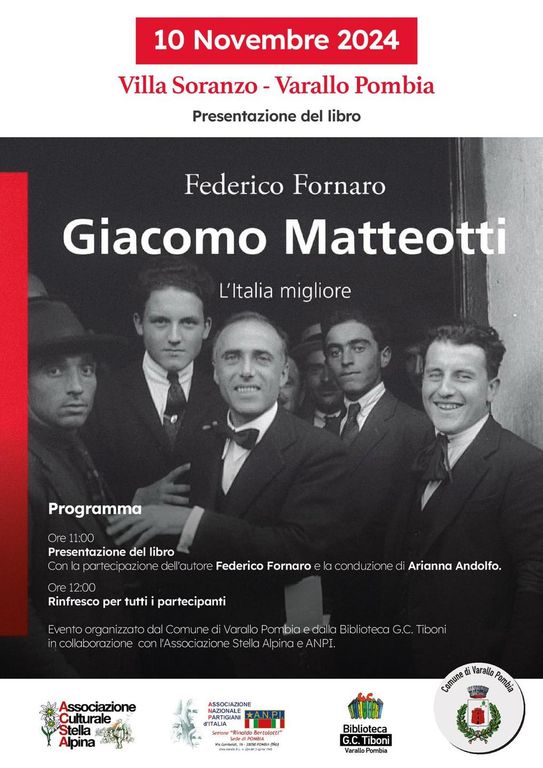 Domenica 10 novembre, Villa Soranzo sarà il luogo d'incontro per tutti coloro che vogliono approfondire la figura di Giacomo Matteotti attraverso il nuovo libro di Federico Fornaro, “Giacomo Matteotti - L’Italia migliore”. La presentazione, organizzata con il sostegno di ANPI e dell’Associazione Stella Alpina, inizierà alle ore 11, con l'autore in dialogo con Arianna Andolfo per esplorare il messaggio e l’importanza storica del volume.