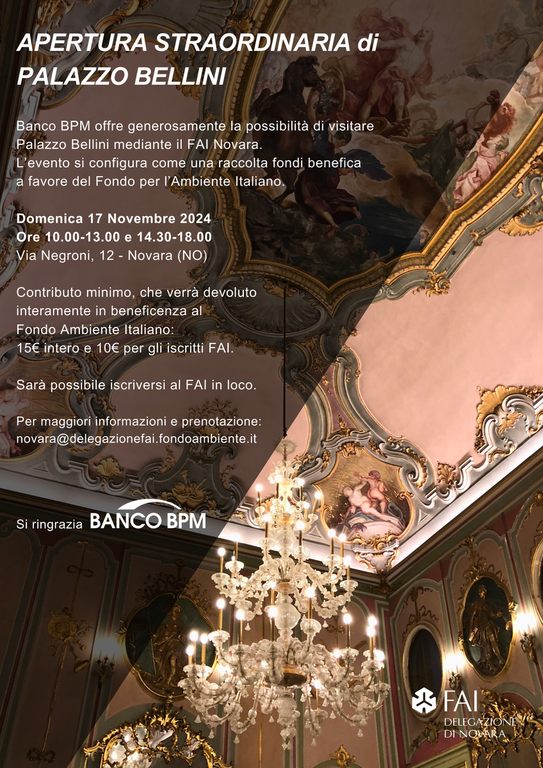 Banco BPM offre generosamente la possibilità di visitare Palazzo Bellini (Via Negroni, 12 - Novara, NO) mediante la Delegazione FAI di Novara in occasione dell’evento “Visita straordinaria a Palazzo Bellini” di domenica 17 novembre dalle ore 10:00 alle 13:00 e dalle 14:30 alle 18:00.