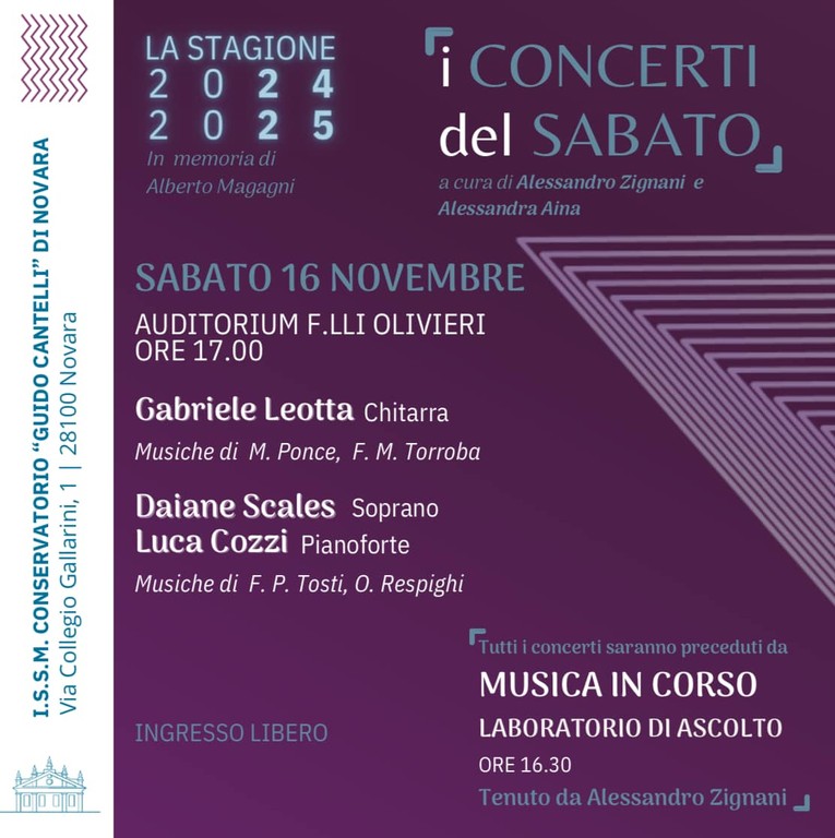 Il secondo appuntamento della rassegna "I Concerti del Sabato" vedrà l'esibizione del chitarrista Gabriele Leotta, che interpreterà composizioni di M. Ponce e F. M. Torroba. Seguirà un'esibizione del duo composto dal soprano Daiane Scales e dal pianista Luca Cozzi, che proporranno brani di F. P. Tosti e O. Respighi.