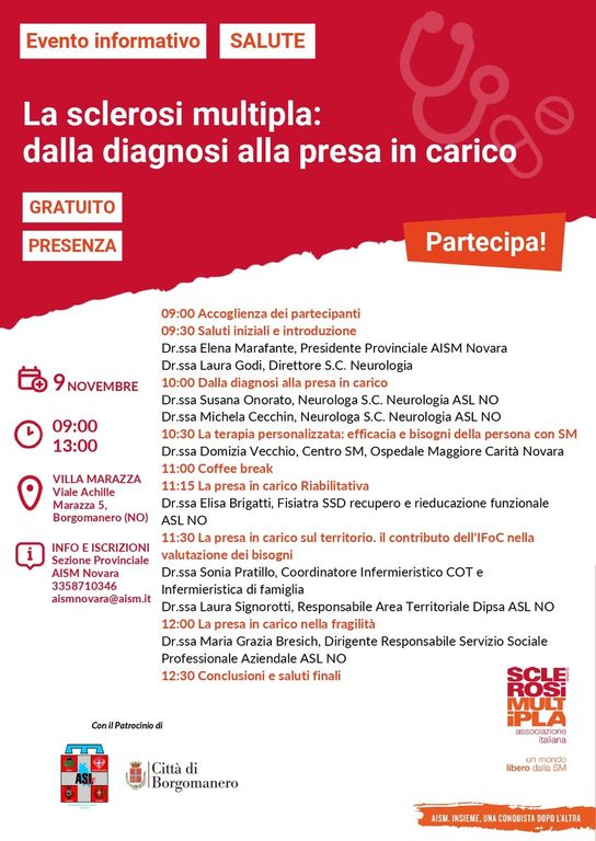 La Sclerosi multipla: dalla diagnosi alla presa in carico” è il titolo del convegno - organizzato da AISM e da Asl Novara - che si è tenuto sabato 9 novembre presso la Fondazione Achille Marazza di Borgomanero con una grande partecipazione di pubblico.