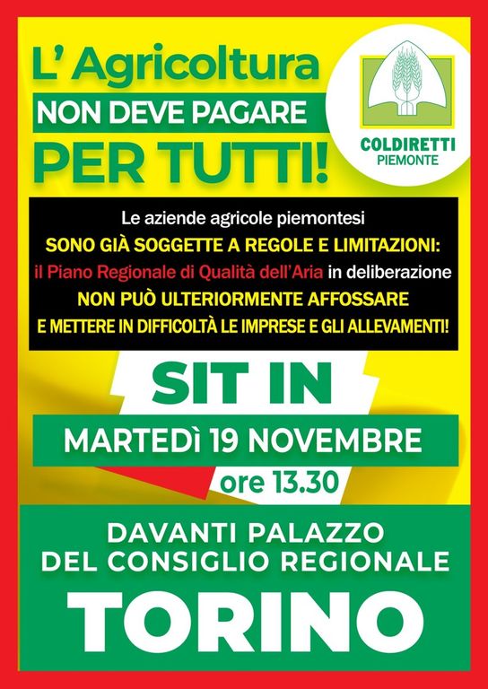 “L’agricoltura non deve pagare per tutti”. Con questo slogan centinaia di allevatori e agricoltori di tutto il Piemonte, insieme a Coldiretti, si riuniranno a Torino per un sit-in in programma per martedì 19 novembre davanti alla sede del consiglio regionale a Palazzo Lascaris.