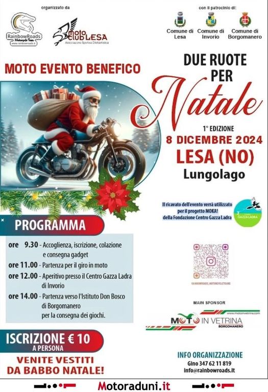 Babbo Natale domenica 8 dicembre sarà sulle due ruote, anzi saranno tanti i Babbo Natale motociclisti che si ritroveranno a Lesa sul lungolago per l'evento benefico dal titolo "Due ruote per Natale".