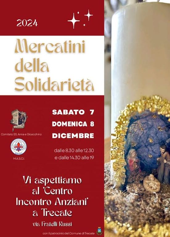 Tornano il 7 e l’8 dicembre i "Mercatini della Solidarietà", un appuntamento imperdibile che avrà luogo nei locali del Centro Incontro Anziani di via Fratelli Russi a Trecate. L’evento è organizzato dal Comitato Santi Anna e Gioacchino, in collaborazione con la sezione trecatese del Movimento Adulti Scout Cattolici Italiani (MASCI), con l’obiettivo di raccogliere fondi a favore delle iniziative benefiche sul territorio.
