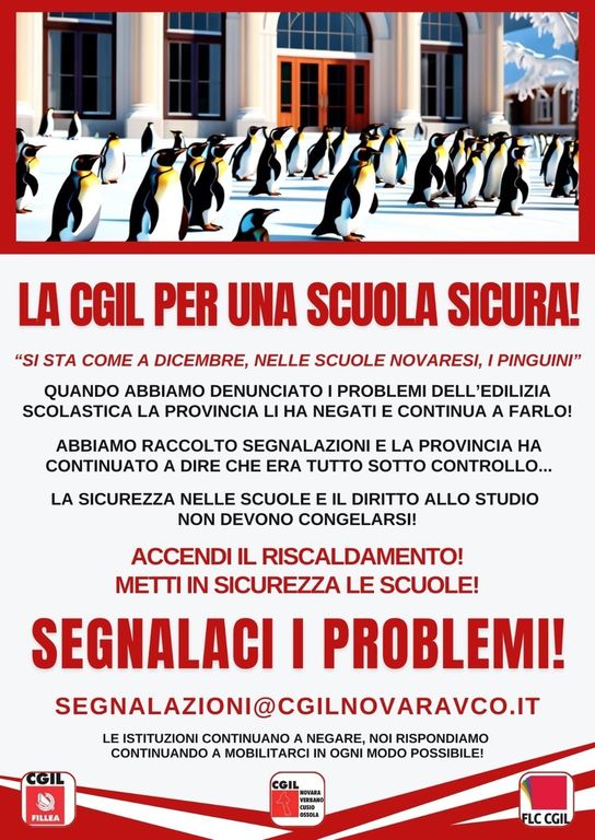 Continuiamo a raccogliere segnalazioni all’indirizzo segnalazioni@cgilnovaravco.it , a mobilitarci per una scuola sicura, a richiedere alla Provincia un tavolo di discussione in grado di illustrarci la situazione nelle scuole di Novara con il dettaglio dei percorsi che si intendono intraprendere al di là del continuare a soffermarsi sullo slogan del “più grande piano di investimenti”.