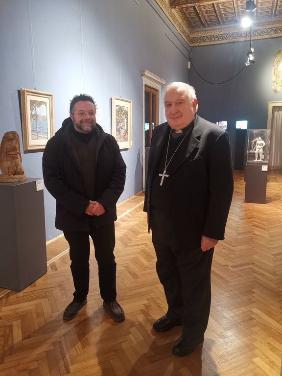 Monsignor Brambilla ammira la collezione permanente e la mostra temporanea, ribadendo l'importanza dell'arte e del paesaggio per lo sviluppo turistico del territorio