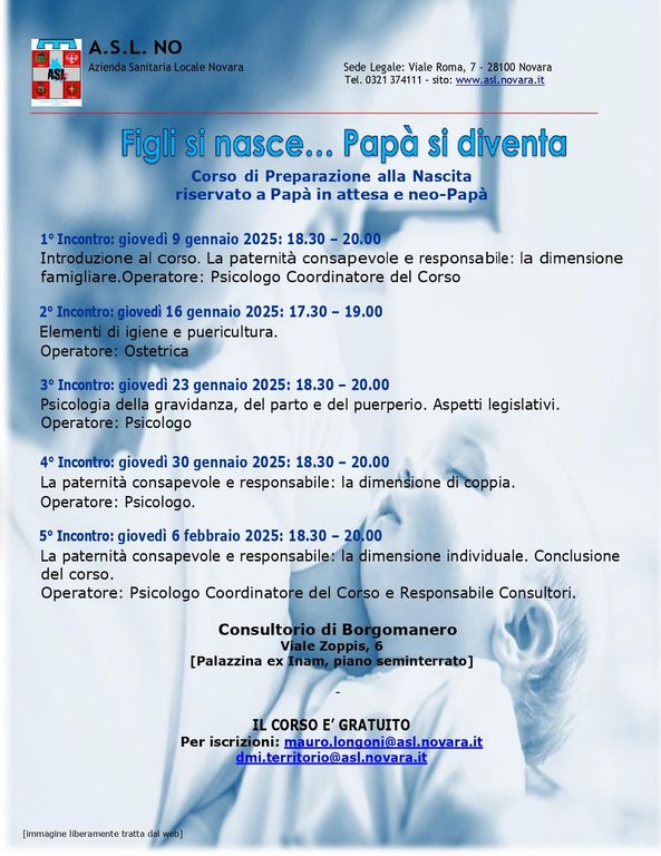 Il corso si integra con i Corsi di Accompagnamento alla Nascita dei Consultori familiari e si compone di 5 lezioni, guidate da esperti tra cui psicologi, ostetriche e assistenti sociali, presso la sede del Consultorio a Borgomanero, in viale Zoppis, 6 (palazzina ex-Inam, piano seminterrato).