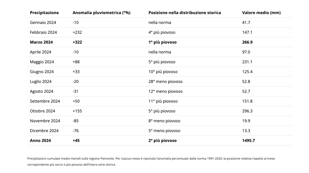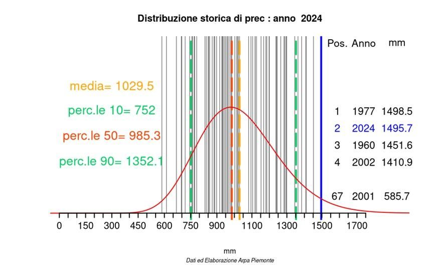 "Dal punto di vista delle precipitazioni annuali in Piemonte, il 2024 ha registrato una precipitazione media di 1495.7 mm, con un’anomalia positiva di 466.2 mm (pari al 45%) rispetto alla norma del periodo 1991-2020, risultando il secondo anno più piovoso della serie storica, dietro al 1977 per soli 3 mm. Se si considera invece la precipitazione caduta sull’intero bacino idrografico del Po alla confluenza con il Ticino, il 2024 risulta avere il primato storico di anno più piovoso superando anche il 1977", spiega Secondo Barbero, direttore generale di Arpa Piemonte.