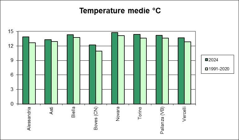 Nei capoluoghi di provincia le temperature massime, medie e minime sono state superiori ai valori del periodo 1991 – 2020, con un maggiore scostamento per le minime. Eccezioni sono le temperature massime ad Asti e Biella che sono risultate in media rispetto al periodo di riferimento e Pallanza in cui si sono attestate su valori lievemente inferiori alla media.