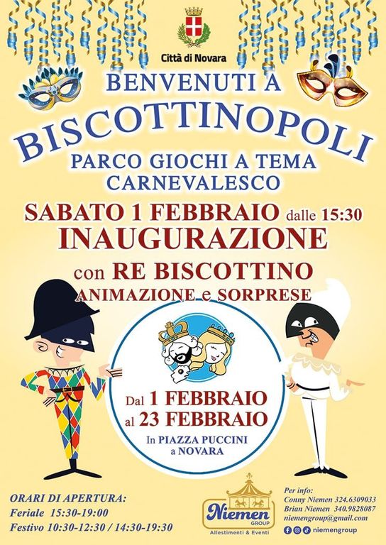 Da venerdì 1° febbraio, piazza Puccini di Novara si trasformerà in un paradiso per i golosi con "Biscottinopoli". Fino al 2 febbraio, i visitatori potranno assaporare una vasta selezione di biscotti artigianali, partecipando a eventi e attività tematiche. Anche questo anno Re Biscottino, la Regina Cunetta e la Nobile Corte dei Dignitari, rallegreranno le Contrade della capitale del Regno con la loro presenza, la loro allegria, le fastose sfilate che per alcuni giorni vedranno protagonista la nostra città.