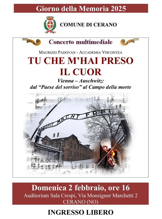 Domenica 2 febbraio 2025, alle ore 16.00, l’Auditorium Sala Crespi di Cerano ospiterà un evento davvero speciale. Il Comune di Cerano ha organizzato un concerto multimediale che vedrà come protagonisti Maurizio Padovan e l’Accademia Viscontea. L’incontro sarà un viaggio emozionante e significativo attraverso le parole di una delle romanze più celebri, scritta da Friedrich Löhner.