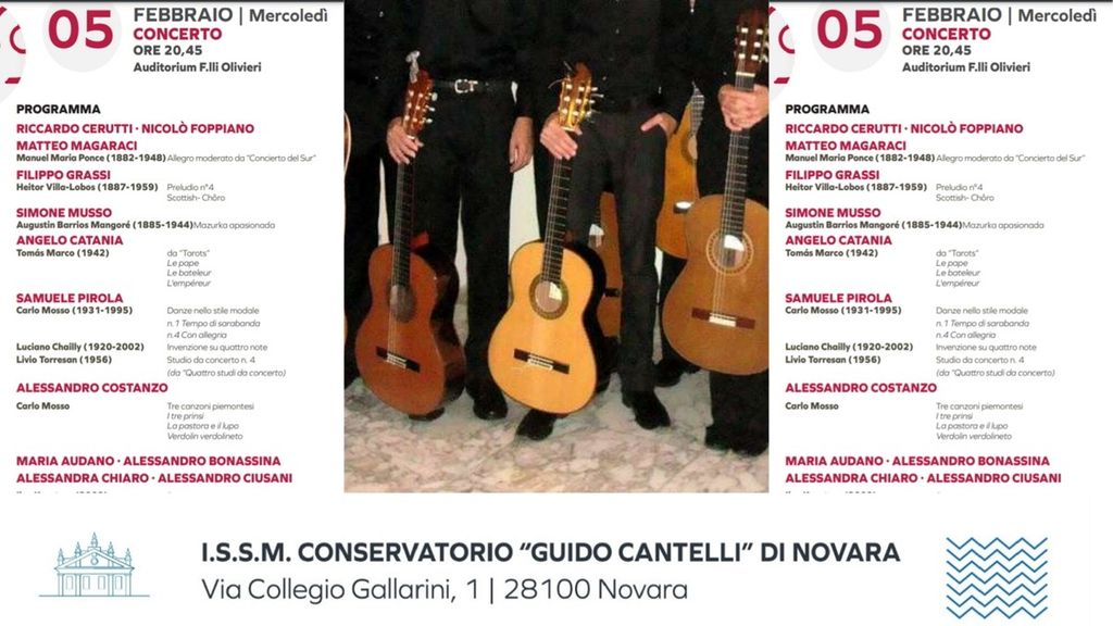 Il programma della serata prevede l'esecuzione di un brano di Manuel Maria Ponce, compositore messicano di grande rilevanza nel panorama della musica per chitarra. I chitarristi Riccardo Cerutti, Nicolò Foppiano e Matteo Magaraci interpreteranno l'Allegro moderato da Concierto del Sur, un'opera che cattura l'essenza della tradizione musicale latinoamericana, con la sua energia ritmica e la sua intensità melodica.