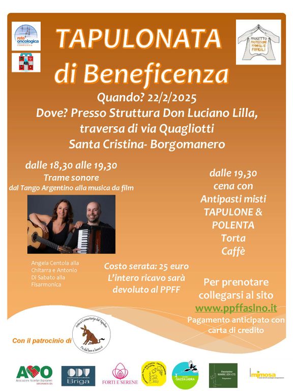 Dalle 18.30 alle 19.30 il duo Trame Sonore (Angela Centola alla chitarra e Antonio Di Sabato alla fisarmonica) accompagnerà i partecipanti con un repertorio che spazia dal tango argentino alle colonne sonore. A seguire, alle 19.30, verrà servita la cena con antipasti e il tipico Tapulone con polenta, sotto il patrocinio dell’Antica Cunsutarija del Tapulon.