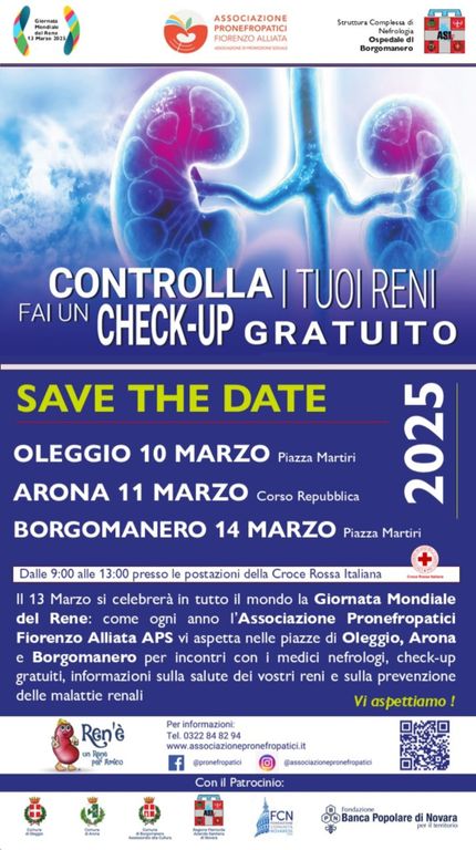 Il tema di quest'anno, “Come stanno i tuoi reni? Promuovere la diagnosi precoce e la protezione della salute dei reni”, ribadisce l'importanza della prevenzione primaria e secondaria, con particolare attenzione alla diagnosi tempestiva. Durante la giornata, sarà possibile effettuare gratuitamente il check-up per la salute dei reni, grazie alla collaborazione tra la Struttura di Nefrologia, la Croce Rossa Italiana, l'Associazione Pronefropatici Fiorenzo Alliata A.P.S. di Borgomanero e il Laboratorio Analisi.