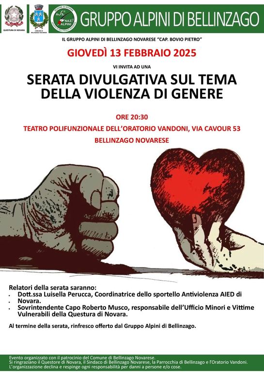 Giovedì 13 febbraio alle ore 20.30, presso il Teatro dell'Oratorio Vandoni, si terrà una serata di riflessione e sensibilizzazione sul tema della violenza di genere. L'incontro, organizzato dal Gruppo Alpini di Bellinzago in collaborazione con la Questura di Novara e con il patrocinio del Comune di Bellinzago, si propone di affrontare una questione purtroppo sempre attuale, cercando di sensibilizzare la comunità e stimolare un dibattito costruttivo.