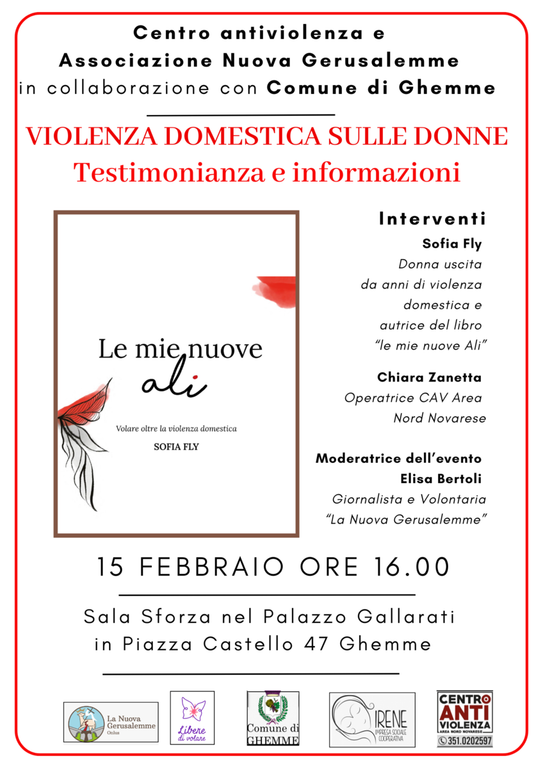 Relatrice, oltre a Sofia, sarà anche la dott.ssa Chiara Zanetta, operatrice del Centro Antiviolenza Area Nord Novarese, che metterà a disposizione dei presenti la propria pluriennale esperienza fornendo dati, indicazioni e consigli concreti. Per raccontare la propria storia, Sofia leggerà infine alcune pagine del suo libretto Le mie nuove ali. Una finestra sull’interiorità di una donna che si è trovata suo malgrado a subire una vita molto diversa da quella che aveva sempre sognato. Una vita simile a quella delle oltre 20 mila donne che ogni anno, in Italia, vengono supportate dai centri antiviolenza dopo anni di maltrattamenti da parte dei loro compagni, mariti, fidanzati.