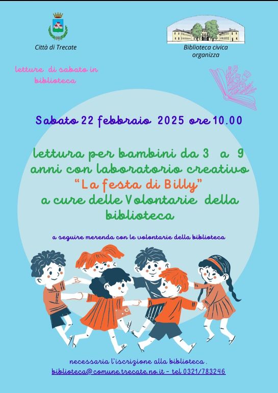 Il 22 febbraio la Biblioteca civica di Trecate organizza un nuovo appuntamento per bambini dai 3 ai 9 anni nell'ambito dell'iniziativa "Letture di sabato in Biblioteca". A partire dalle 10, i piccoli partecipanti potranno ascoltare la lettura del libro "La festa di Billy", seguita da un laboratorio creativo e una merenda, il tutto curato dai volontari della Biblioteca.
