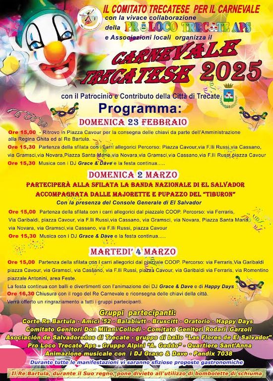Il Carnevale Trecatese 2025 è pronto a partire con un programma ricco di eventi che unisce tradizione e novità. Il Comitato trecatese per il Carnevale, insieme alla Pro Loco e a numerose associazioni locali, ha ufficializzato il calendario degli appuntamenti, organizzati con il patrocinio e il contributo della Città di Trecate.