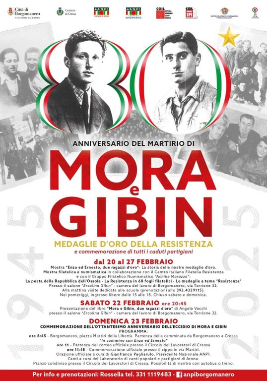 Sabato 22 febbraio alle 20:45, il salone "Ercolina Gibin" della Camera del Lavoro di Borgomanero ospiterà la presentazione del libro “Mora e Gibin, due ragazzi d’oro”, scritto da Angelo Vecchi. L’opera ricostruisce la storia di Enzo Mora ed Ernesto Gibin, due giovani partigiani che pagarono con la vita il loro impegno nella lotta per la libertà.