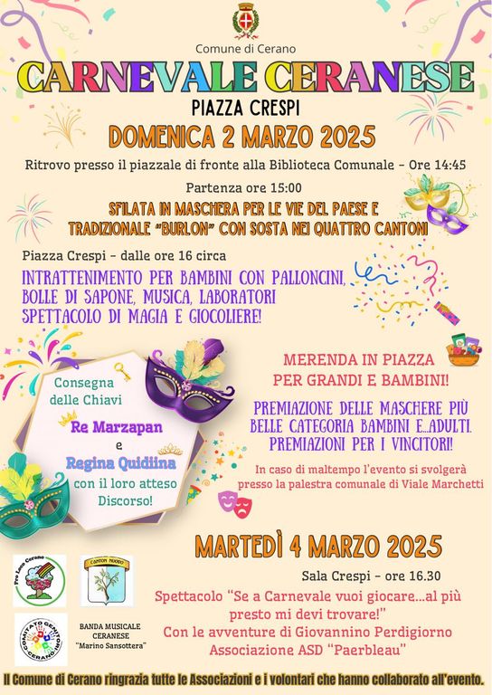 Cerano si prepara a vivere un Carnevale all'insegna dell'allegria e della tradizione con il Carnevale Ceranese, che animerà le strade del paese domenica 2 marzo 2025. L’evento, organizzato dal Comune con la collaborazione delle associazioni locali, promette un pomeriggio di festa per bambini e adulti.