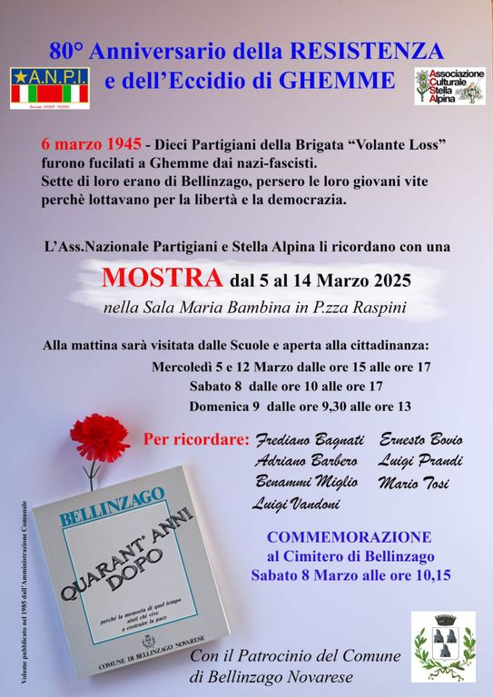 Dal 5 al 14 marzo 2025, il Salone dell’Oratorio Maria Bambina ospiterà una mostra dedicata all’80° anniversario dell’Eccidio di Ghemme, avvenuto il 6 marzo 1945. L’iniziativa è promossa dall’Anpi Ovest Ticino e dall’Associazione Culturale Stella Alpina, con il patrocinio del Comune di Bellinzago Novarese.