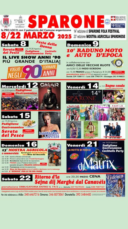 La 14a edizione dello Sparone Folk Festival si inserisce in una serie di eventi in programma dall'8 al 22 marzo, che vedranno sul palco anche tre tra le più importanti orchestre di musica da ballo, Omar Codazzi (mercoledì 12), Marianna Lanteri (sabato 15) e Federica Cocco (sabato 22).