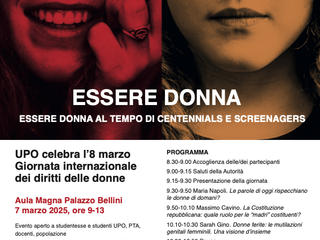 Venerdì 7 marzo 2025, dalle 9 alle 13, l’Aula magna di Palazzo Bellini, in via Solaroli 17 a Novara, ospiterà il convegno "Essere donna al tempo di Centennials e Screenagers". L’evento, organizzato dalle professoresse Patrizia Zeppegno e Carla Gramaglia dell’Università del Piemonte Orientale, si inserisce nel contesto della Giornata internazionale dei diritti delle donne e si propone come un’occasione di riflessione a più voci sul ruolo femminile nella società contemporanea.