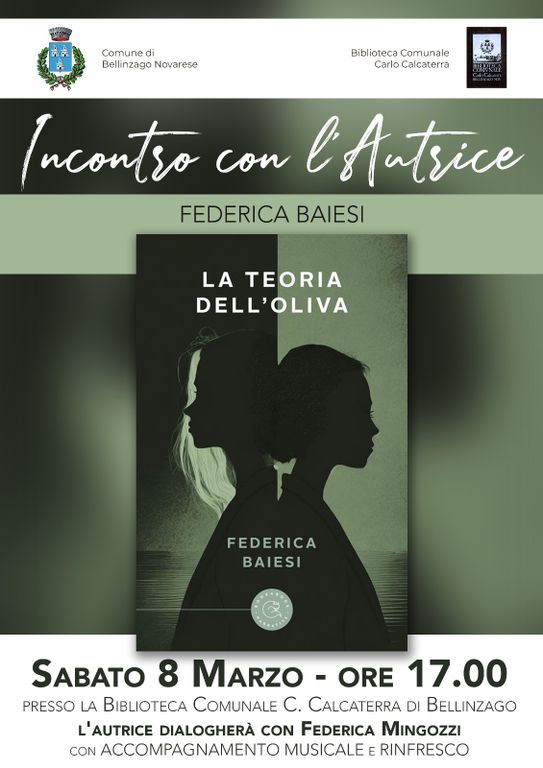 Sabato pomeriggio la Biblioteca Comunale ospiterà la presentazione del libro La teoria dell'oliva di Federica Baiesi. L’evento, che si terrà presso la Sala Angela Vandoni sabato 8 marzo a partire dalle ore 17.00, vedrà la partecipazione dell’autrice in dialogo con la professoressa Federica Mingozzi, Presidente del Consiglio di Biblioteca.