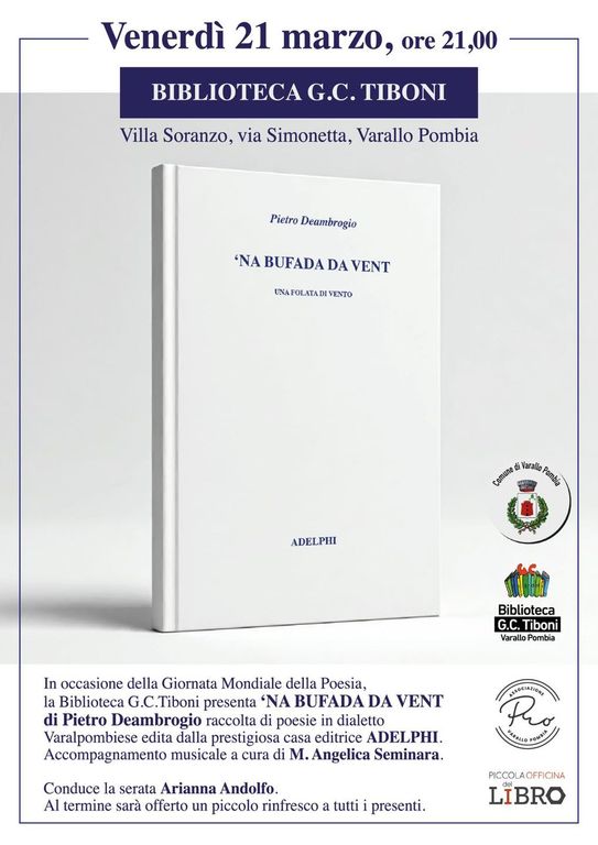 Venerdì 21 marzo, alle ore 21:00, Villa Soranzo ospiterà un evento speciale dedicato alla poesia e alla tradizione linguistica locale: la presentazione di 'Na Bufada da Vent, la raccolta di poesie in dialetto varalpombiese di Pietro Deambrogio.