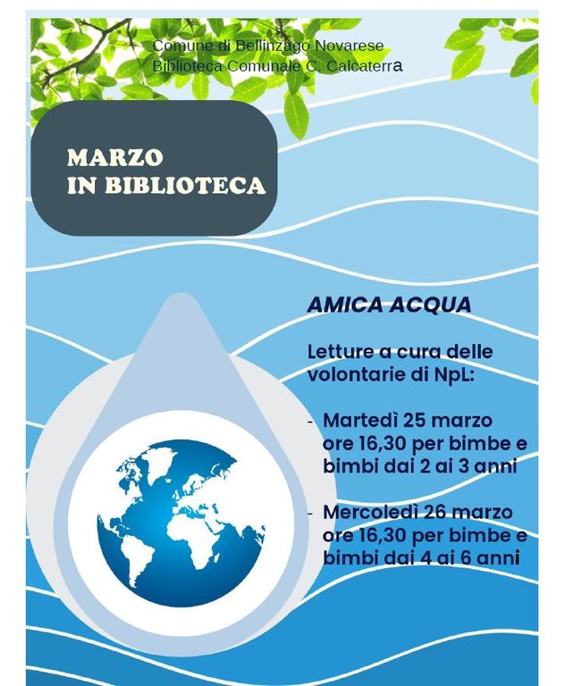 L'iniziativa si terrà martedì 25 marzo alle ore 16.30 per i bambini di 2-3 anni, e mercoledì 26 marzo alle 16.30 per quelli di 4-6 anni, presso la Biblioteca di Bellinzago Novarese. Sarà l'occasione per scoprire insieme storie che insegnano ai piccoli il valore dell'acqua e il nostro ruolo nel preservarla.