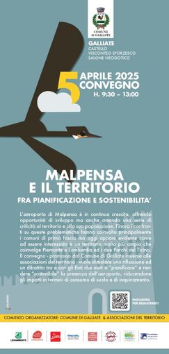 L'Amministrazione Comunale di Galliate e altre Associazioni del territorio hanno organizzato un convegno dedicato a Malpensa dal titolo "Malpensa e il territorio - Fra pianificazione e sostenibilità". Si terrà presso il Castello Visconteo Sforzesco nel Salone Neogotico dalle ore 9:30 alle ore 13:00 io 5 aprile.