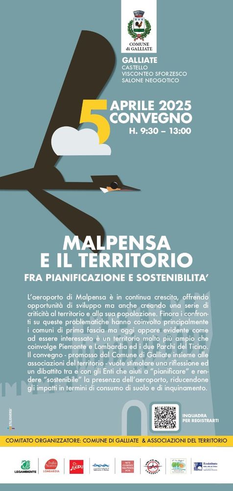 L'Amministrazione Comunale di Galliate e altre Associazioni del territorio hanno organizzato un convegno dedicato a Malpensa dal titolo "Malpensa e il territorio - Fra pianificazione e sostenibilità". Si terrà presso il Castello Visconteo Sforzesco nel Salone Neogotico dalle ore 9:30 alle ore 13:00 io 5 aprile.