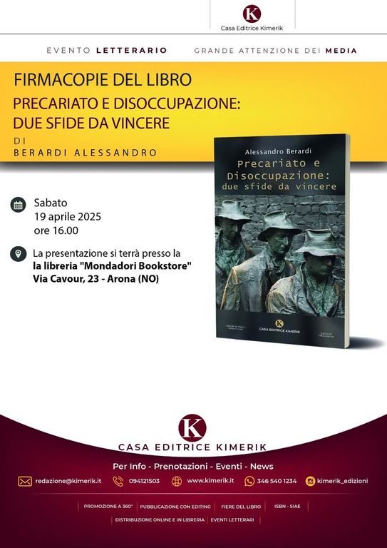 Sabato 19 aprile, dalle ore 16:00 alle ore 18:30, presso la libreria Mondadori Bookstore di Arona, in via Cavour 23, si terrà un evento imperdibile per gli amanti della lettura: il firma-copie del nuovo libro di Alessandro Berardi, “Precariato e Disoccupazione: due sfide da vincere”, tra i titoli più venduti della Casa Editrice Kimerik, attualmente al 20° posto in classifica. L’autore, vincitore del prestigioso "Premio alla Contemporaneità", ricevuto lo scorso dicembre nella città di Eboli (SA), affronta con il suo libro tematiche di grande attualità sociale. L’opera analizza due delle sfide più urgenti della nostra società: il precariato e la disoccupazione. Con un approccio unico e personale, Berardi combina ricerca accurata e testimonianze autentiche, dando voce a chi spesso resta inascoltato. Attraverso storie di vita reale, invita alla riflessione sulle difficoltà quotidiane di molti e a immaginare un possibile cambiamento.