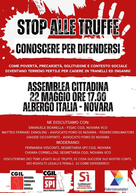 Giovedì 22 maggio 2025, alle ore 17.00 presso l’Albergo Italia di Novara (via P. Solaroli 8), si terrà un’assemblea pubblica dedicata a un tema di grande attualità e rilevanza sociale: le truffe, in particolare ai danni degli anziani, ma non solo.
