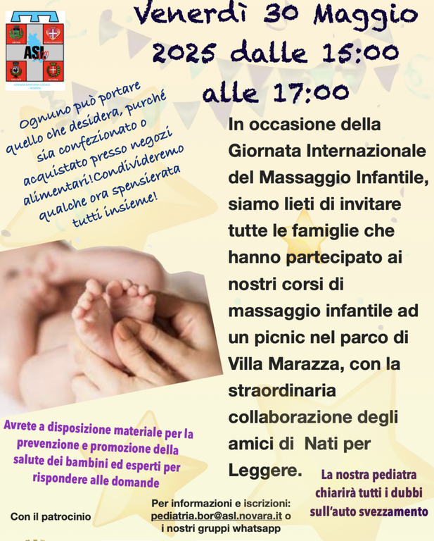 Un momento di ascolto, empatia e vicinanza dedicato ai più piccoli e alle loro famiglie. In occasione della Giornata Internazionale del Massaggio Infantile, che si celebra il 7 giugno, l’ASL di Novara, attraverso il Dipartimento Materno Infantile, organizza per venerdì 30 maggio 2025, dalle 15:00 alle 17:00, un evento speciale presso il Parco di Villa Marazza a Borgomanero.