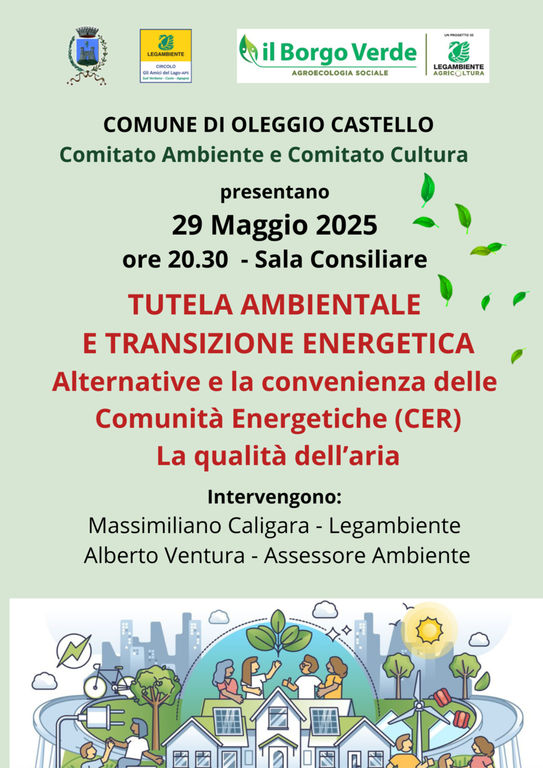 La serata sarà dedicata alla tutela ambientale e alla transizione energetica, con particolare attenzione alle Comunità Energetiche Rinnovabili (CER), uno strumento innovativo che consente ai cittadini di produrre, condividere e consumare energia pulita a livello locale, generando vantaggi economici, ambientali e sociali.