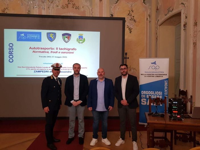 Si è svolto nella mattinata di oggi, martedì 27 maggio, nel salone delle feste di Villa Cicogna, un importante corso di formazione sul tachigrafo digitale organizzato dal Sindacato Autonomo di Polizia in collaborazione con la Polizia locale di Trecate e patrocinata dalla Città di Trecate. "All’iniziativa – riferiscono il sindaco Federico Binatti e il comandante della Polizia locale Pier Zanatto, che hanno partecipato portando i saluti istituzionali - hanno partecipato novantaquattro operatori di Polizia provenienti da numerosi Comandi delle Polizie locali del Novarese, delle province di Verbania e Alessandra e della Lombardia e da diverse sezioni di Polizia Stradale della Polizia di Stato del Piemonte e della Lombardia. Un’adesione significativa, che conferma la rilevanza del tema e la necessità di un costante aggiornamento professionale su materie tecniche e normative, come il controllo dei tempi di guida e riposo dei conducenti professionali".