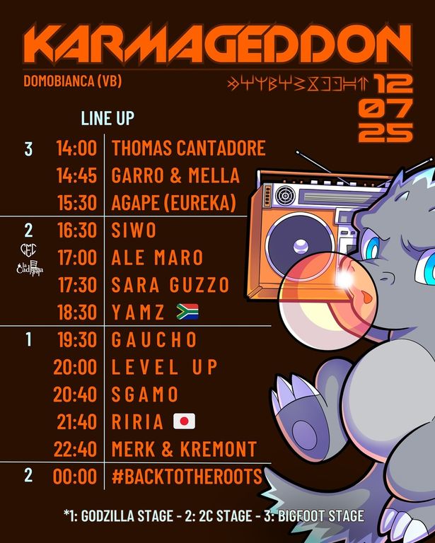 La musica sul palco del Godzilla Stage si accende dalle 19.30 con le sonorità di Gaucho, Level Up, Sgamo e dalle 21.40 di Riria, altra ospite internazionale di Karmageddon 2025. Nata a Tokyo, ora stabilmente residente a Londra, l’artista giapponese propone uno stile di matrice britannica, con sound Amapiano, Jersey Club e Dub. Con brani di epoche e scene diverse, i suoi set regalano energia e vibrazioni. Il suo set al Boiler Room Tokyo 2024 l'ha resa famosa a livello globale come DJ all'avanguardia.