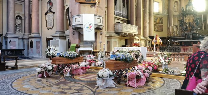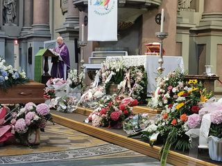 In chiesa distrutte dal dolore, le famiglie del due designer: il papà, la mamma e i fratelli di Mario Paglino, la mamma e la sorella di Gianni Grossi. Le esequie sono state celebrate da don Renzo Cozzi, parroco della basilica. La pagina di vangelo scelta è stata quella della morte e della resurrezione di Lazzaro. Il sacerdote, iniziando l’omelia ha detto che “per loro la morte è arrivata come un ladro, per noi come un terremoto nel boato di uno schianto”.