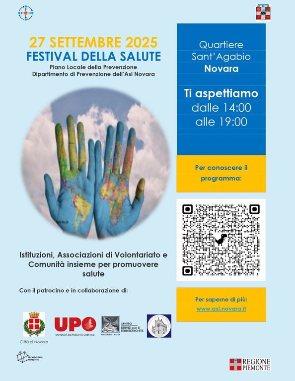 Sabato 27 settembre prende il via la terza edizione del Festival della Salute, un’iniziativa consolidata sul territorio novarese dedicata alla prevenzione e alla promozione della salute, promossa nell’ambito del Piano Locale della Prevenzione. Il primo evento si svolgerà a Novara, nell’ambito della tradizionale festa del Quartiere di Sant’Agabio, dalle 14:30 alle 19:00, con il patrocinio del Comune, dell’Università del Piemonte Orientale, del Centro Servizi per il Territorio Novara e Vco, e della Parrocchia locale. Alla manifestazione prenderanno parte numerose associazioni di volontariato e istituzioni del territorio.