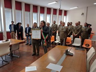 Martedì 23 settembre, presso la sala consiliare, il sindaco Fabio Sponghini ha consegnato al Colonnello Giuseppe Eccellente la targa per il conferimento della cittadinanza onoraria al Reggimento Gestione Aree di Transito (RSOM), che quest’anno celebra dieci anni di attività sul territorio comunale presso la caserma Babini.