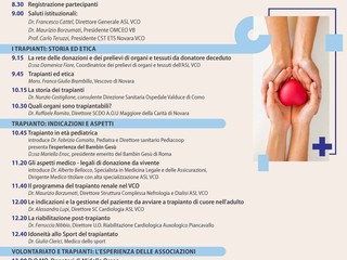 Il convegno aprirà con i saluti del direttore generale Asl VCO Francesco Cattel, del Presidente Omnce VB dott. Maurizio Borzumati (che relazionerà poi sul trapianto di rene) e del presidente Cst Carlo Teruzzi e vedrà la partecipazione di illustri medici del nostro territorio che, ognuno secondo il proprio campo di intervento, relazioneranno sugli aspetti legati ai trapianti di organi, ma non solo. La rete della donazione con la d.ssa Domenica Fiore, Coordinatrice dei prelievi di organi e tessuti dell’Asl VCO; la sfera etica con il Vescovo Mons. Giulio Brambilla, i trapianti in età pediatrica, introdotti da dott. Fabrizio Comaita e a cura dellad.ssa Mariella Enoc - presidente emerito del Bambin Gesù di Roma - che porterà la sua esperienza; il trapianto di cuore con il Direttore della cardiologia dell’ASL VCO dott. Alessandro Lupi. E ancora le testimonianze delle associazioni che sul territorio si occupano di donazione di organi e sensibilizzazione al tema: Donatori Ossolani Midollo Osseo e AmaRene. Un taglio, quello del convegno, certamente rivolto alle professioni del settore (è accreditato per 3 ECM), ma capace di trattare dei temi e di utilizzare un linguaggio alla portata di tutti.