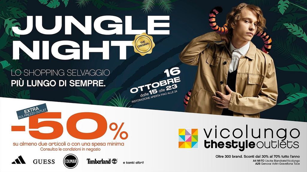 13 ottobre 2025. Vicolungo The Style Outlets è pronto a trasformarsi, ancora una volta, in una giungla urbana con la Jungle Night: la serata più “selvaggia” della stagione!