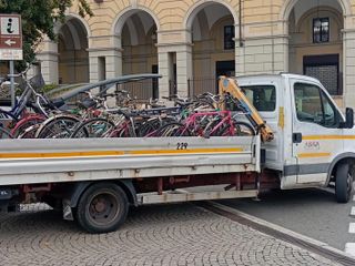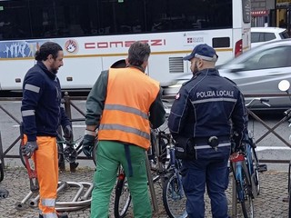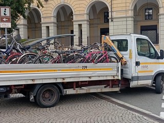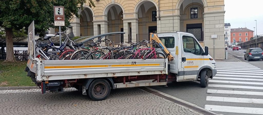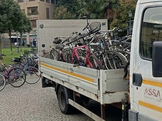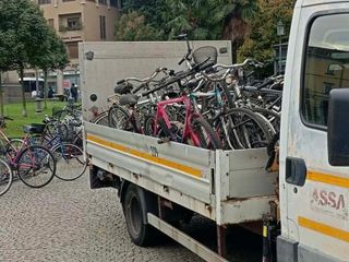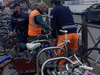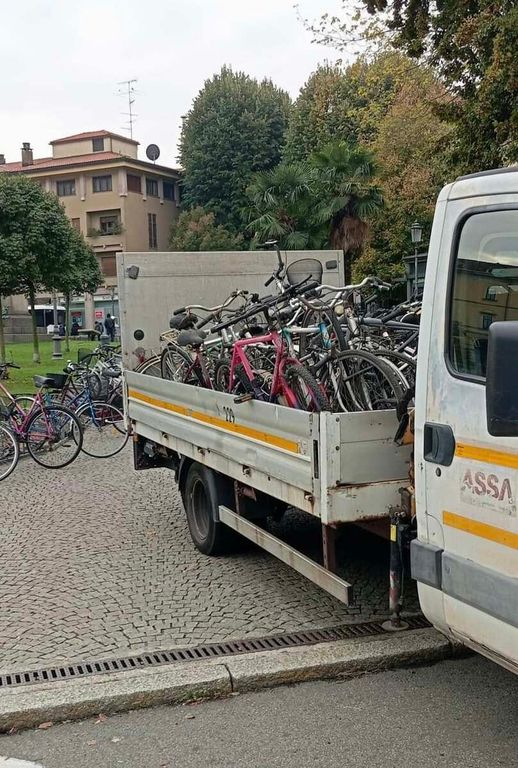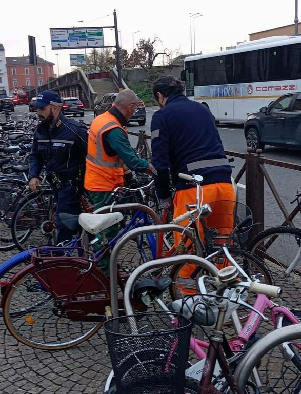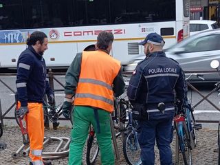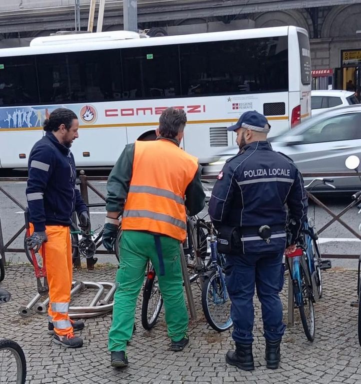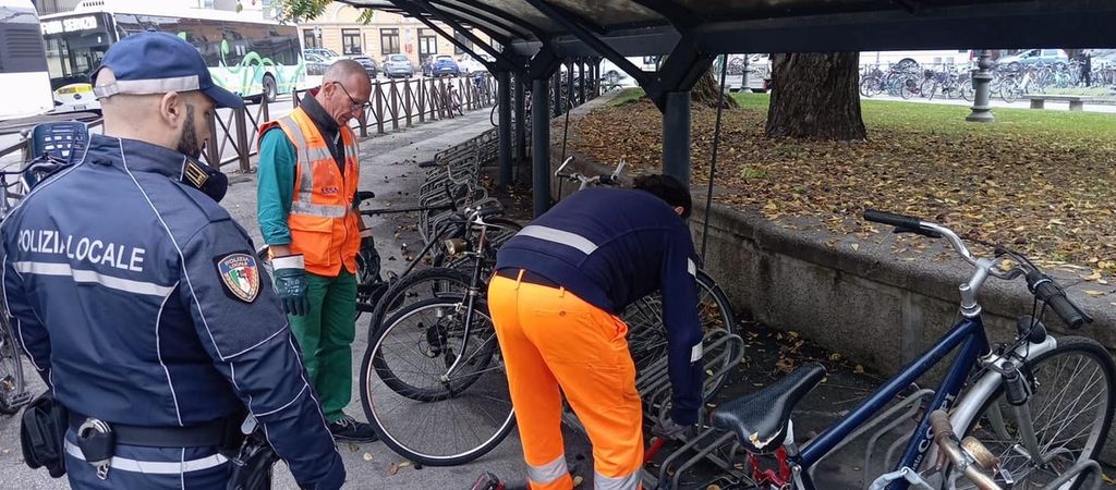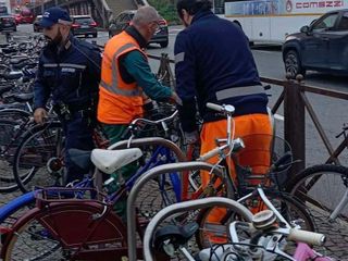 Durante l’operazione sono state rimosse circa trenta biciclette abbandonate, molte delle quali ridotte ormai a semplici carcasse. I mezzi, legati alle rastrelliere o alle ringhiere, sono stati prelevati e trasportati via con un furgone per essere smaltiti correttamente.
