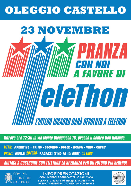 Domenica 23 novembre, il Comune di Oleggio Castello invita tutti a partecipare al pranzo solidale a favore di Telethon, organizzato in collaborazione con il Circolo Ricreativo di Oleggio Castello.
