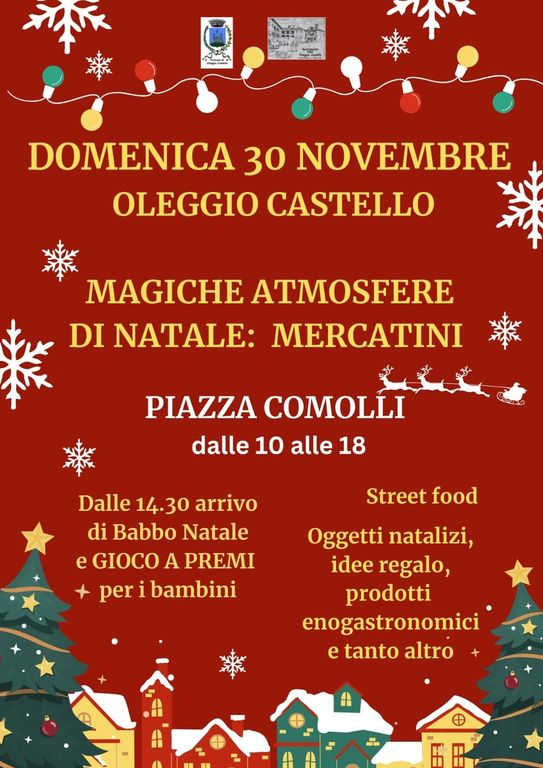 Domenica 30 novembre Oleggio Castello si prepara a vivere una giornata all’insegna dello spirito natalizio con l’evento “Magiche Atmosfere di Natale: Mercatini”, in programma in Piazza Comolli dalle 10 alle 18. La piazza del paese si trasformerà in un villaggio festoso con bancarelle, addobbi e luci colorate, offrendo ai visitatori un’occasione perfetta per respirare l’aria delle feste e trovare idee regalo originali.