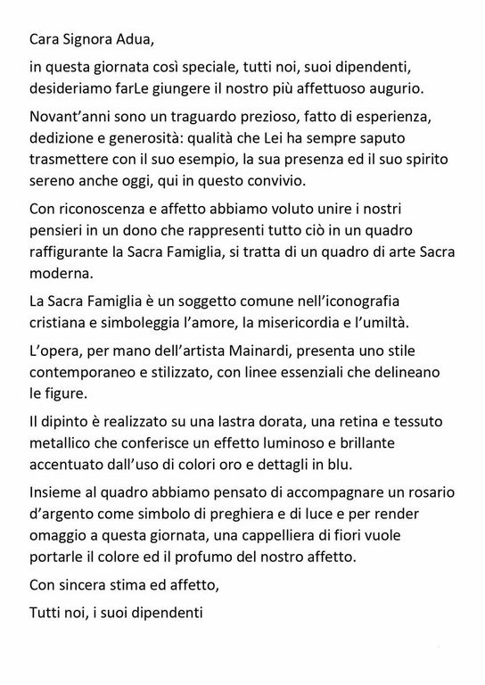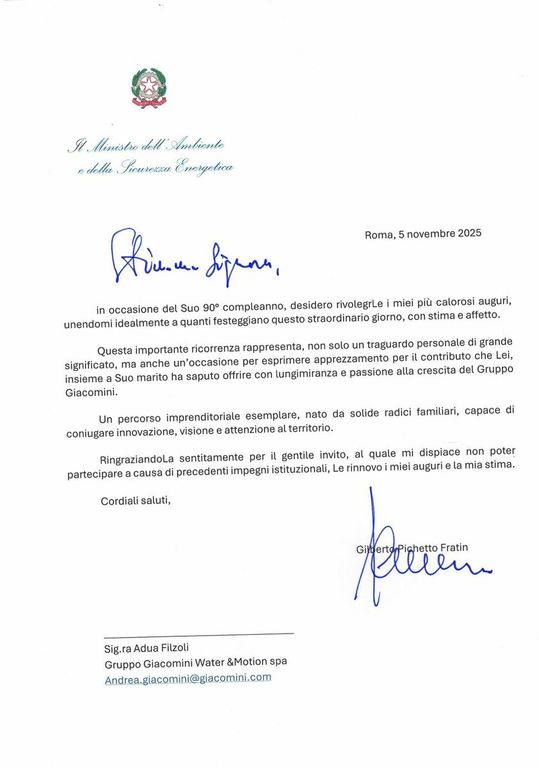 Domenica non si è celebrato solo il 90º compleanno di una donna, ma anche e soprattutto i 75 anni di vita passati nella sua azienda insieme alle sue maestranze, che lei ha sempre considerato “la sua famiglia”. Col passare degli anni la Giacomini è divenuta simbolo dell’eccellenza, della tradizione e dell’innovazione italiana.