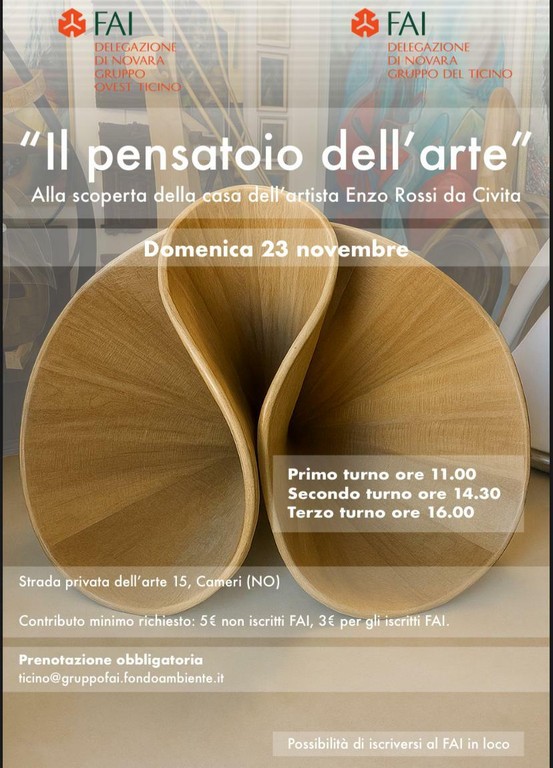 Il Fai – Fondo per l’Ambiente Italiano, con il Gruppo Fai Ticino e il Gruppo Fai Ticino Ovest, propone per domenica 23 novembre un appuntamento imperdibile: la visita esclusiva alla casa-studio dell’artista Enzo Rossi da Civita, un luogo dove creatività, artigianalità e pensiero artistico si intrecciano da una vita intera.