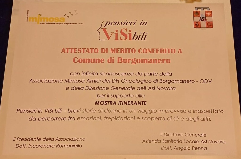 Tra questi anche i Comuni che hanno aderito con entusiasmo alla mostra itinerante “Pensieri InViSibili”, recentemente ospitata a Villa Marazza in collaborazione con l’ASL Novara. La targa di riconoscimento è stata ritirata dall’assessore Franco Cerutti in rappresentanza dell’Amministrazione comunale.