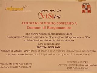 Tra questi anche i Comuni che hanno aderito con entusiasmo alla mostra itinerante “Pensieri InViSibili”, recentemente ospitata a Villa Marazza in collaborazione con l’Asl Novara. La targa di riconoscimento è stata ritirata dall’assessore Franco Cerutti in rappresentanza dell’Amministrazione comunale.